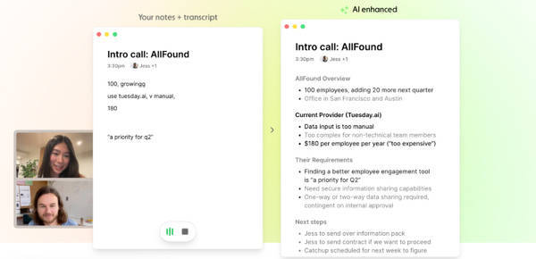 Granola联合创始人兼CEO Chris Pedregal将它形容为“会听的数字笔记本”:不仅能记录你手写的会议笔记,还会实时转录对话,并在会后扩展和优化笔记内容,让你只需专注记录关键信息,其余的交给AI处理。这样在回顾时,不仅能看到原始记录,还能获得完整的会议上下文。