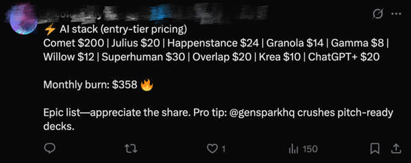 有网友根据订阅价格计算,这10款工具按入门级方案的总开销约为每月358美元(约合人民币2500元)。