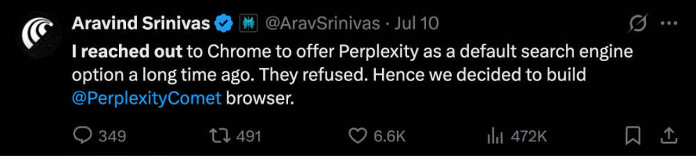 Perplexity AI联合创始人兼CEO Aravind Srinivas曾指出,如果不构建AI原生操作系统,就无法提供可靠的主动个性化助理。事实上,Perplexity最初曾与Google Chrome商谈将自家搜索设为默认入口,但遭到拒绝,这也促使团队决定自行打造Comet浏览器。