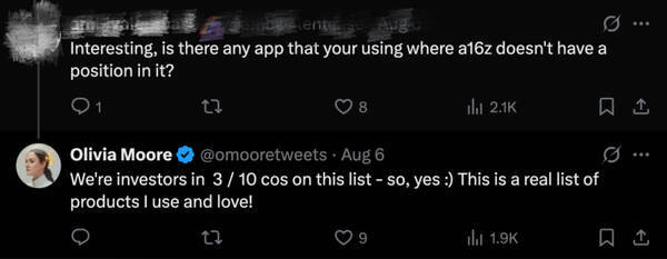 在评论区,有网友直接问她:“有没有你用的AI工具,a16z没投过?”Olivia回复称,这份清单中的10款产品里,只有3款是a16z投资组合公司,其余均与投资关系无关,“这是我真正在用、且喜欢的产品”。