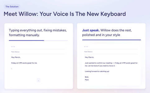 Willow Voice成立于2025年,是一款AI驱动的语音输入工具,支持所有macOS应用。它可以将语音实时转成规范文本,自动识别专业术语、纠正语法并去除口语化填充词。